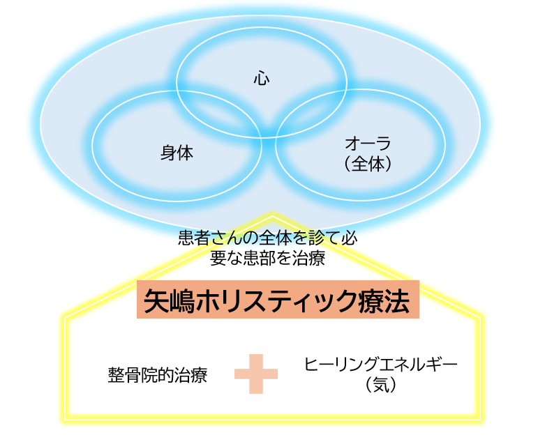 ホリスティックとは統合医療・全体的観点という意味ですが,当院の矢嶋ホリスティック療法は、患者様の全体(身体・心・全体等々)を診て患部 を治すために必要なヒーリングエネルギー(気)を与え回数を少なく最短期間で治すことを目的とした当院独自のトータルケア療法です。 心と体のバランスを整え病気や痛みの原因を根本的治療致します。「病院に行っても原因が分からなかった・治らなかった方」「医薬品等に頼 りたくない方」など是非当院に一度足をお運びください。